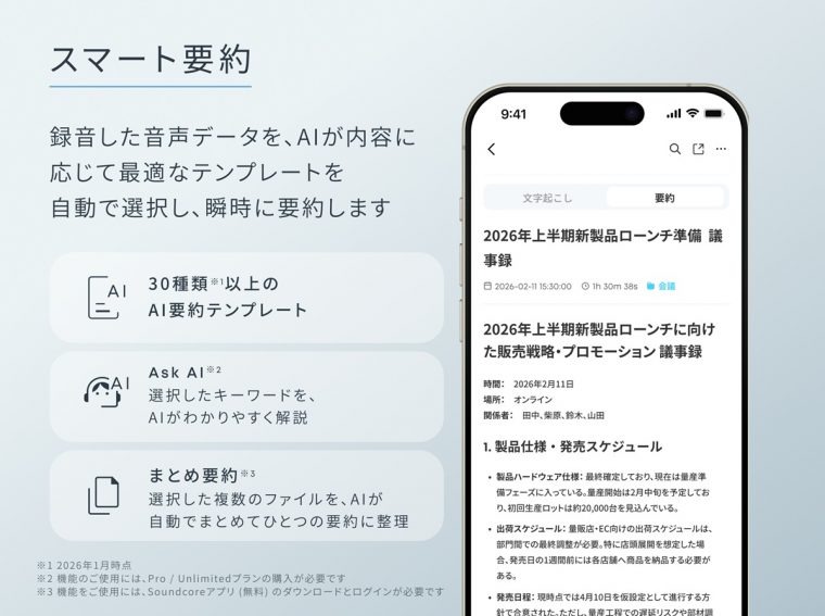 ※AIによる文字起こしや要約機能を使用する際は、Soundcoreアプリのインストールとログインが必要です。