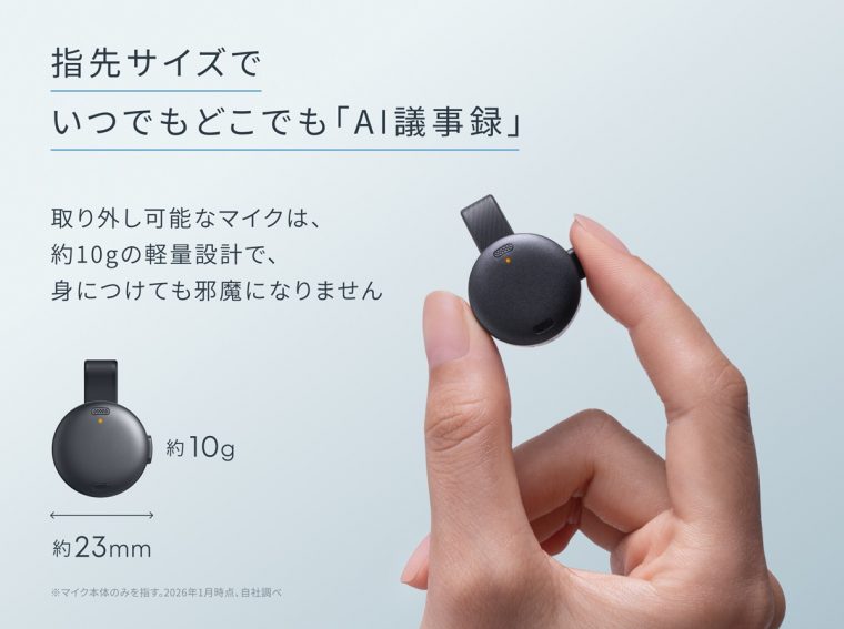 音声を録音し、文字起こしだけでなく議事録作成や要約まで行ってくれるAIボイスレコーダー。会議や商談のあとの議事録作成の手間を省いて、仕事を効率的に行えます。マイクは取り外し可能なコンパクトサイズで、使用中も目立ちません。