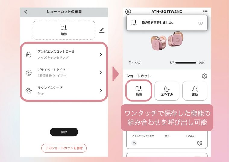 気分や使用シーンに合わせて切り替えられる「ショートカット機能」を新たに採用しており、ノイズキャンセリングなどのアンビエンスコントロール、自然のサウンドなどが聴けるサウンドスケープや、自分だけに音を知らせるプライベートタイマーの機能を自由に組み合わせてショートカットとして作成しておき、ワンタッチで使用できます。