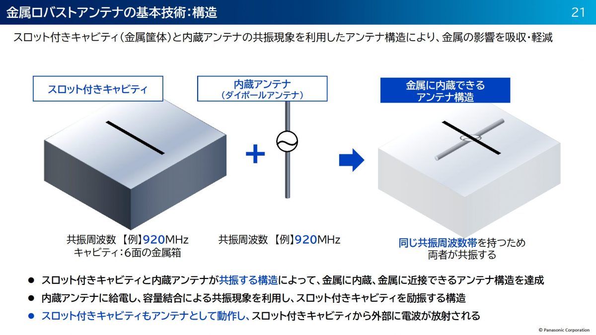 キャビティのスロットに交差するようアンテナを内蔵することで発生する共振現象によって、キャビティそのものをアンテナとして動作させることができるというのだ。むろんこのスロットの長さには規定があり、波長のおよそ半分の長さが必要とされる。たとえばBluetoothの波長は10cmだからスロット長は5cm見当となる。
