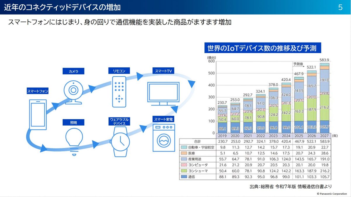 「直近2019年からの世界のIoTデバイス数の推移・予測を見ますと、モノの大小、用途の屋内外を問わず、年10%程度の伸びを見せています。パナソニックエレクトリックワークス社(以降EW社)でも、出先から、宅内からを問わずに操作できる“家のスマート化”の仕組みづくりを推進しています」