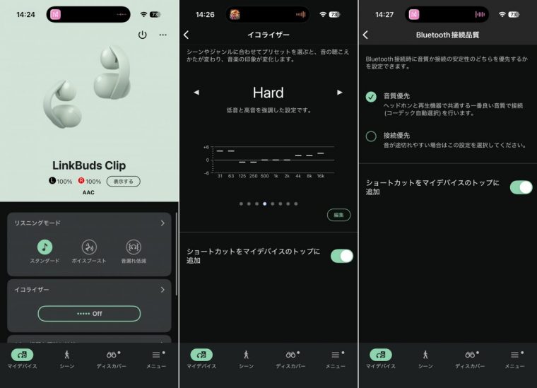 LinkBuds Clipも、通常のカナル型イヤホンなどと比較すると低音は物足りません。けれど、オープンイヤーとして見れば十分な低音です。音質もソニーらしいバランス感を重視したもので、正直な感想としては「まぁこんなところかな」と思っていました。