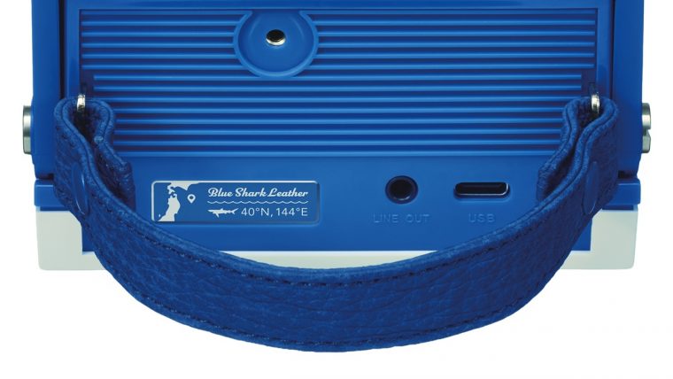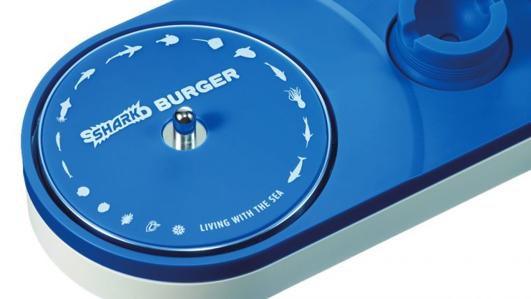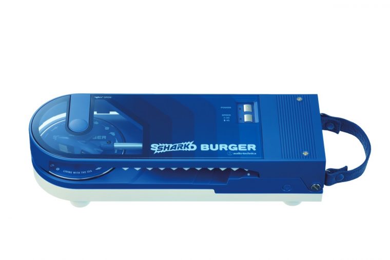 「シャークバーガー」は、レコードを挟むだけでどこでも気軽にアナログサウンドを楽しめるというユニークなコンセプトのポータブルレコードプレーヤー「サウンドバーガー」をベースに、気仙沼産サメ革を背面ハンドルに採用。