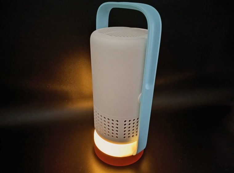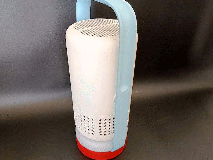 製品を手に取ると、上部に取っ手のついたランタンのような形が特徴的なボディと、水色とオレンジのポップな色合いが目を引きます。こちらのカラーは「Soda Blue」で、カラバリとして灰色を基調とした「Cloud Ash」も用意されています。