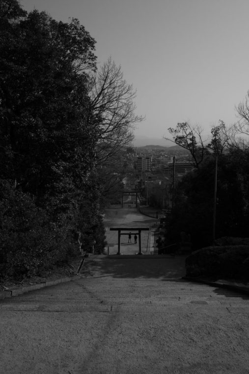 手前の草木と石造りの階段、鳥居、砂利道、もう一つの鳥居、道路、街、ビル、空、山と一つ一つが連なっている、モノクロームならではの表現が垣間見える写真だなと思います。