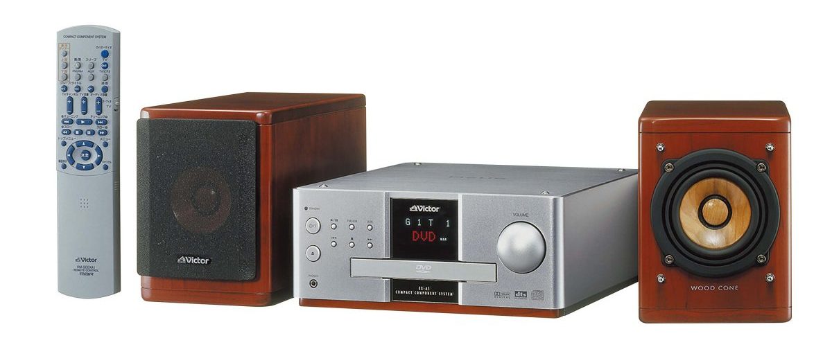 世界初のウッドコーンスピーカーはDVDコンポとして発売。ユニットは8.5cmフルレンジ、キャビネットはチェリー無垢材を採用した。