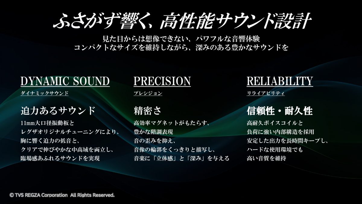 ドライバーにはΦ11mmの大口径振動板と高効率マグネットを採用。高耐久ボイスコイルで、高い信頼性と耐久性の実現をうたいます。