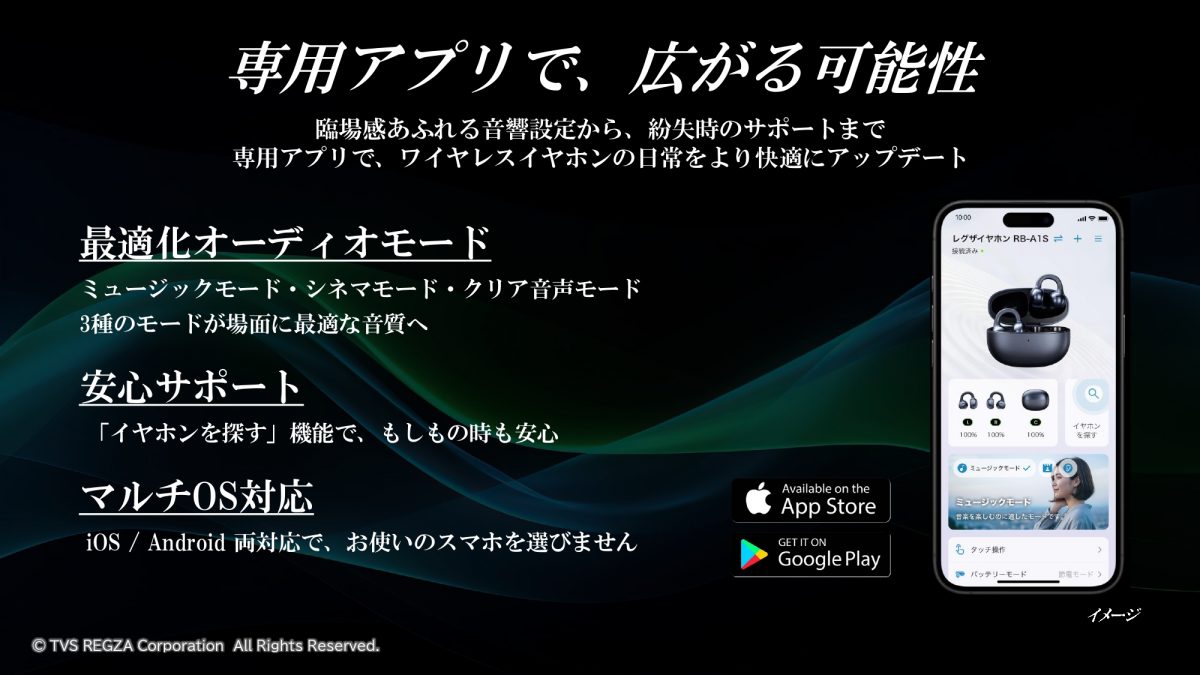 TVS REGZAは2026年4月21日、オープンイヤータイプのイヤーカフ型イヤホン「レグザイヤホン RB-A1S」(以下、RB-A1S)を発表しました。市場想定価格は26,400円(税込)です。
