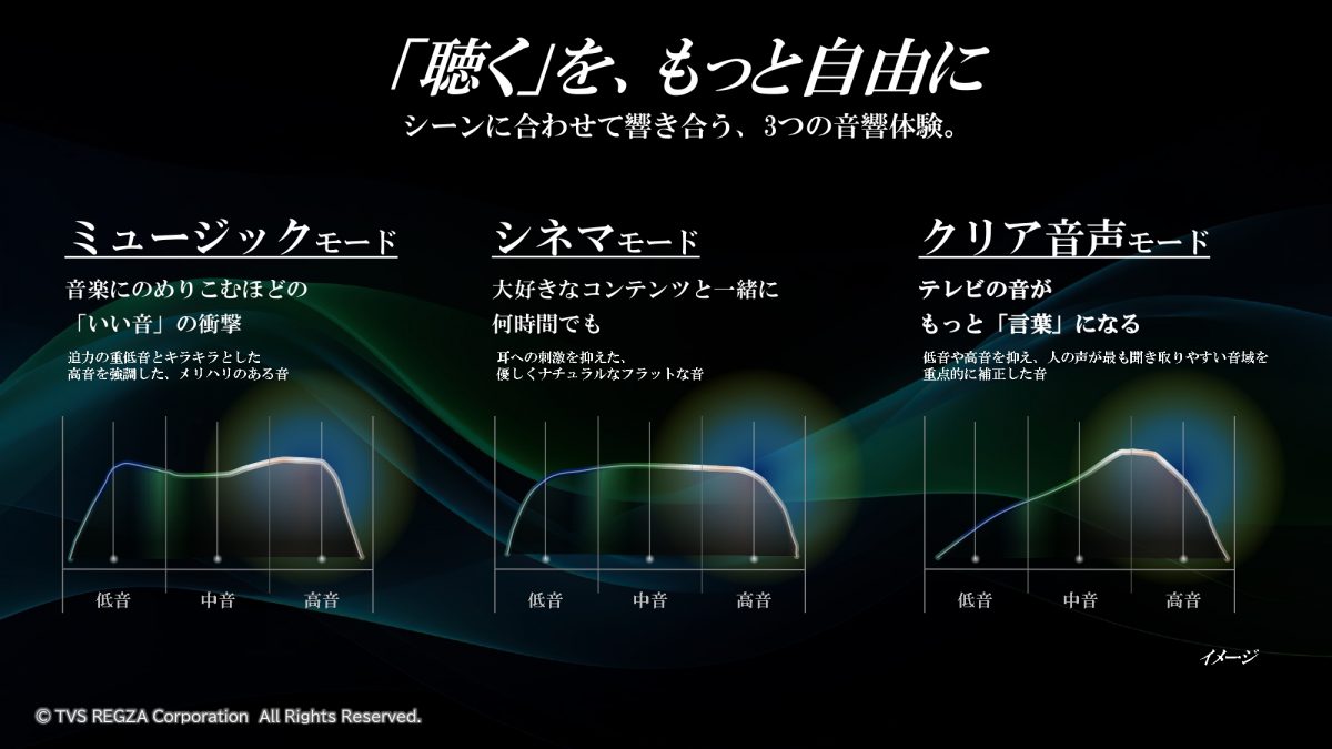 オーディオモードには、迫力の低音とキラキラとした高音を強調する「ミュージックモード」、ナチュラルでフラットな特性の「シネマモード」、人の声を聞き取りやすくした「クリア音声モード」の3モードを用意。シーンにあわせて切り替えることで、映像コンテンツ試聴や通話といった用途でも使いやすくなっています。