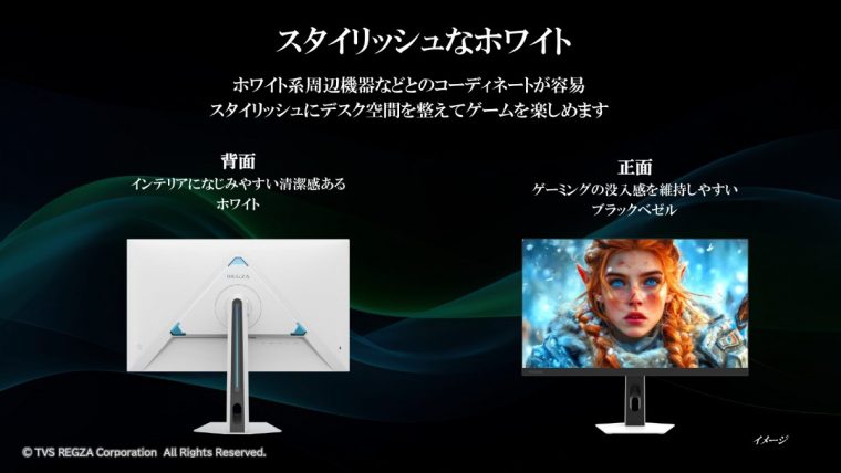 2024年11月からシリーズ展開するレグザゲーミングモニターですが、今回は新しいカラバリとしてホワイトモデルを用意しているのが特徴です。