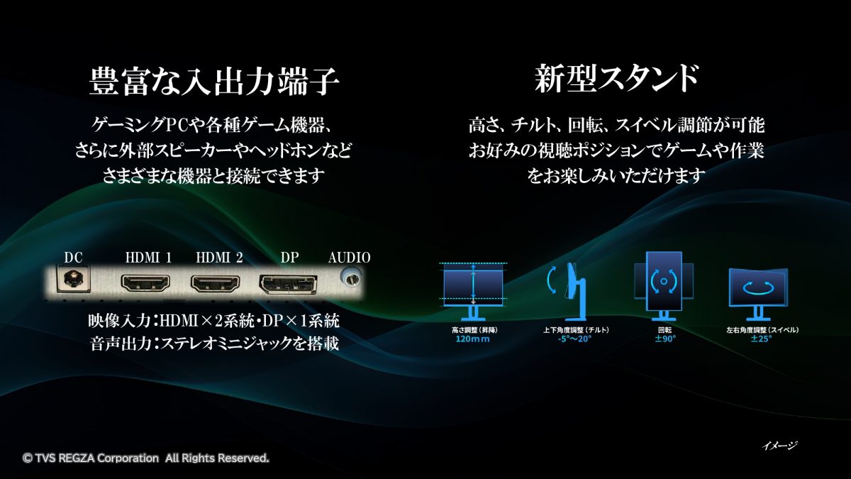 入出力端子はHDMIが2系統、DisplayPortが1系統の計3系統を用意。新型スタンドは高さ調整と回転、左右角度調節ができるようになっています。