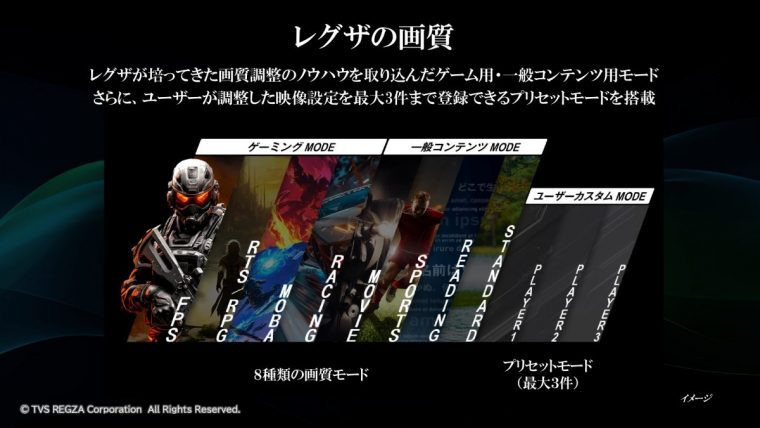 パネルには最大200Hzのリフレッシュレートに対応する「Fast IPSパネル」を採用。ゲームジャンルやゲーム以外のコンテンツにあわせた8種類の画質モードを用意しており、ユーザーカスタムプリセットも3種類登録できます。