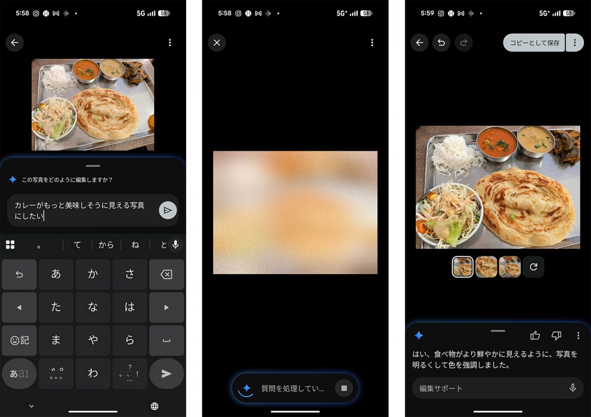 これ以外にも、Googleフォトの編集機能がとても使いやすく実用的になっています。例えばGeminiによる「編集サポート」機能を使えば、テキストプロンプトから「料理の写真をもっと明るく美味しそうにして」と入力すると、明るさや色合い、写真の構図を即座に最適化してくれます。