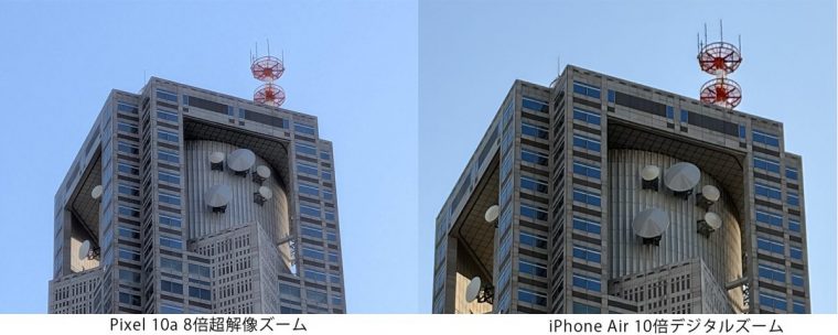 超解像デジタルズームは最大8倍まで対応しています。上位のPixel 10 Proシリーズが搭載する「超解像ズーム Pro」の最大100倍ズームほどのインパクトはないものの、そのぶんAIによる補正が自然に感じられて、デジタルズーム特有の画像の破綻が少ない「使えるズーム」に仕上がっている印象を受けます。