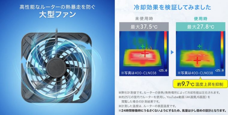 年々暑さが増す日本の夏は、機械にとっても過酷な環境です。そこで便利なのが、小型ファンを搭載したサンワの冷却クーラー。エアコンのない部屋にルーターなどの機器を置いている家庭は取り入れてみてはいかがでしょうか。
