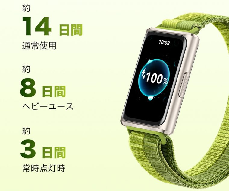 進化した高密度シリコンバッテリーを採用することで、多機能でありながら通常使用で最長14日間、ヘビーユースで約8日間使用可能。5ATM防水規格に対応しており、水中のスポーツ時にも装着可能です。