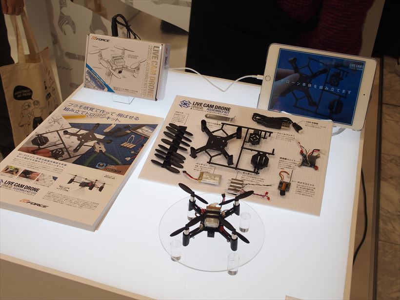 今回の展示に合わせて初お披露目となったのが、G-Forceの組み立てドローンキット。G-Forceは超小型のドローンを前回の三越銀座店でも展示していましたが、今回はプラモデルのようにキットになった、自分で組み立てる式ドローンを展示、販売しています。完成したドローンはスマホと連携し、専用アプリで操作することが可能。ライブ映像の撮影まで行える本格派です。
