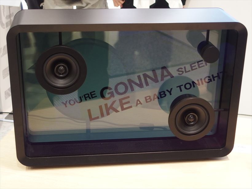 個人的に気になったのは、再生中の楽曲の歌詞が表示されるスピーカー「Liric speaker」。すでに各所で取り上げられている人気商品なので知っている人も多いと思いますが、ぜひ一度、実際に見ていただきたいアイテムです。歌詞が次々と表示される様は、見ていて本当に楽しくなります。