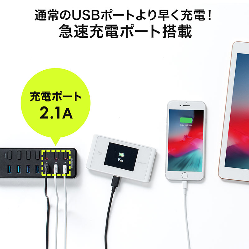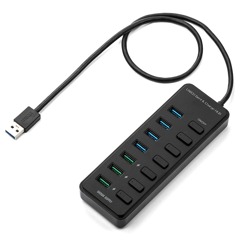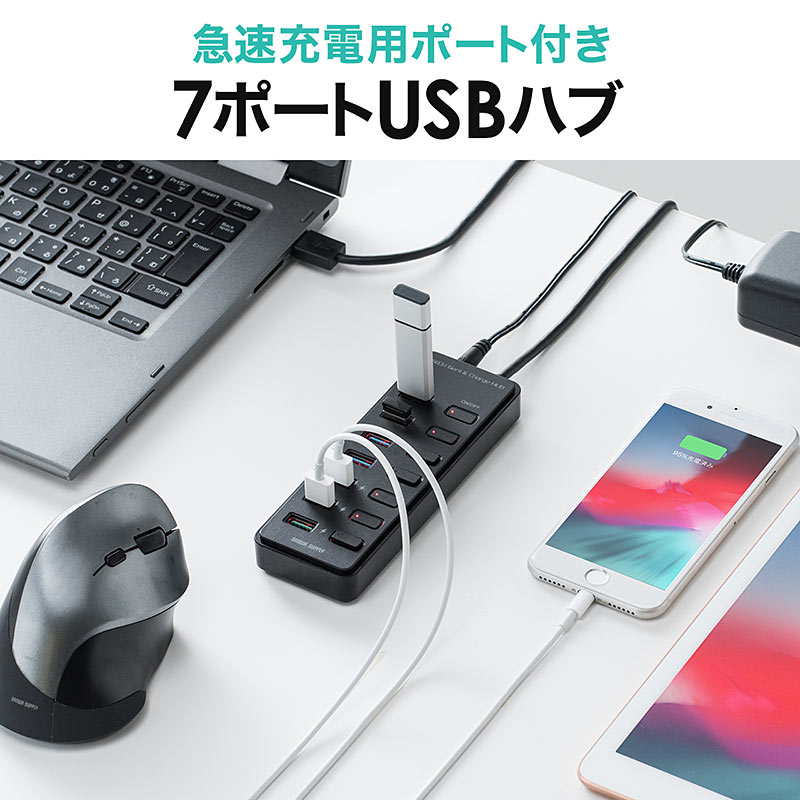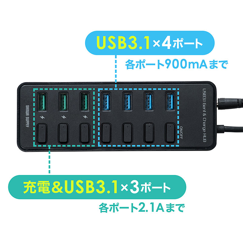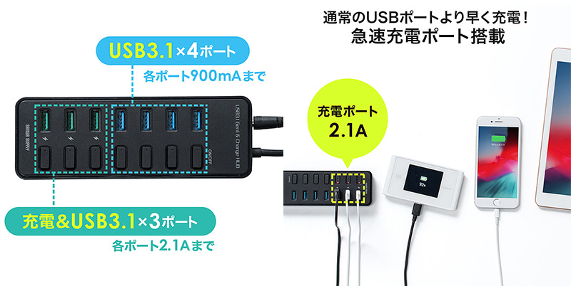 本機は、個別スイッチを搭載した7ポートハブで、ポートはすべてUSB 3.1となります。うち3つはスマートフォンやタブレットを充電できる2.1Aで、さまざまな周辺機器の充電器代わりとしても使えます。