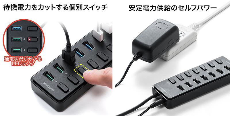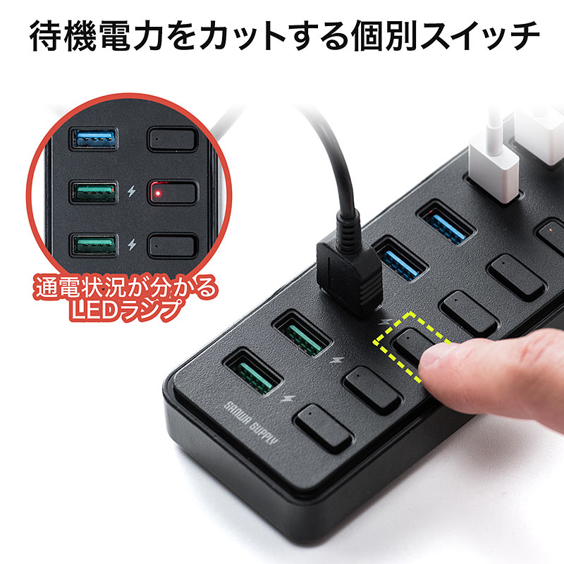 接続したパソコンの電源を落としても、各3ポートともに2.1Aの充電器として利用できるのもポイント。待機電力をカットする個別スイッチを搭載し、機器の過充電の防止、一目で通電の有無が確認できます。