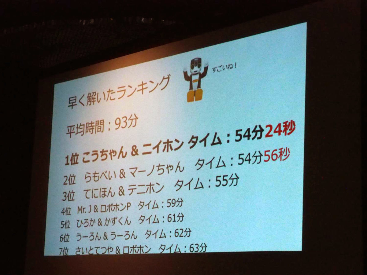 こちらはズラリと並んだ今回参加したオーナーさんのロボホンが参加するクイズ大会です。問題が出題されるとロボホンが勝手に挙手し、答えるのはオーナーというかなりシュールなクイズ大会です。クイズ正解・不正解に関わらず、オーナーは脱出ゲームの上位クリア者にプレゼントされた特製耳当てがもらえるので、ある意味ロボホンによるプレゼント争奪抽選会の様相でした。