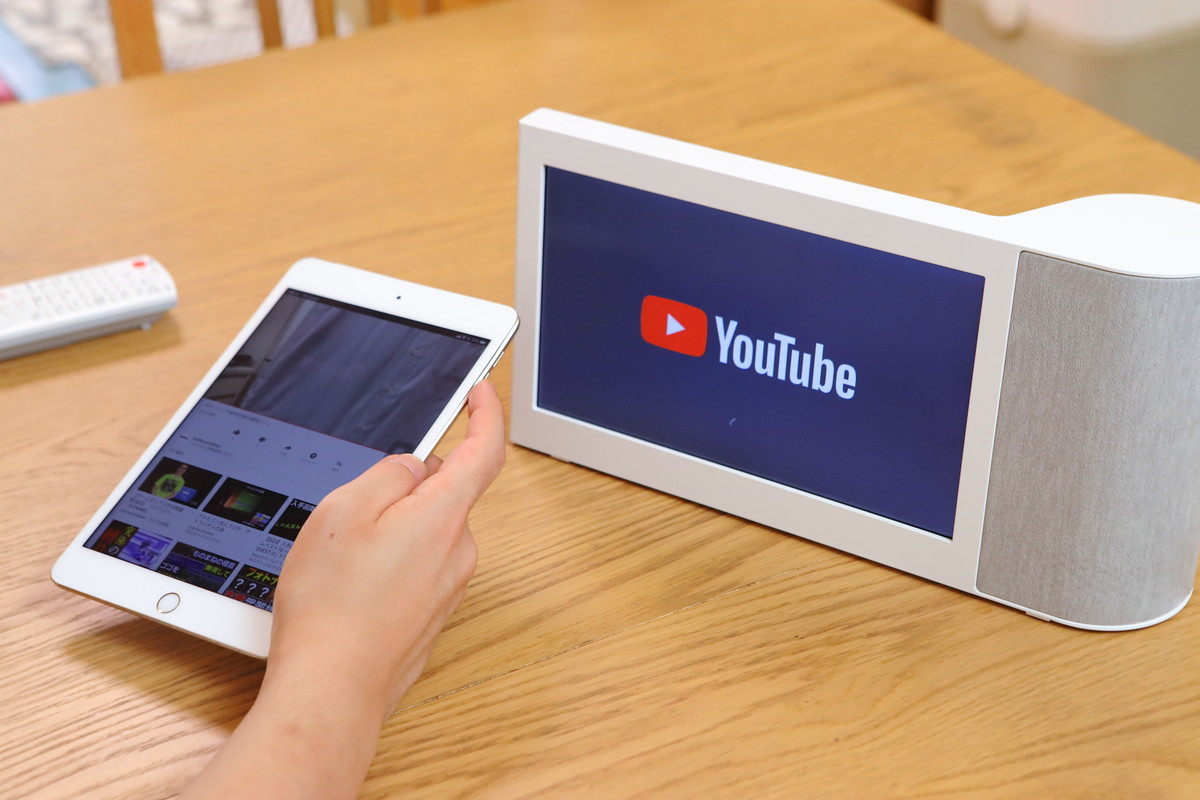 スマホ側でYouTubeアプリを立ち上げ、視聴したい動画を見つけたら、スマホ画面隅の「キャスト」アイコンをタッチすると、「モニター付きワイヤレススピーカー」側で動画の再生がスタートします。本機能のポイントは、“動画を再生しているあいだでもスマホは自由に使える”というところ。
