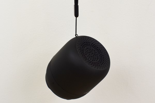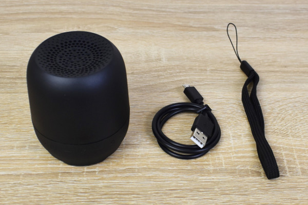 箱から取り出すと、黒で統一されたシックなスピーカーがお目見え。他にも充電に必要な USBケーブル、リストストラップが付属していました。