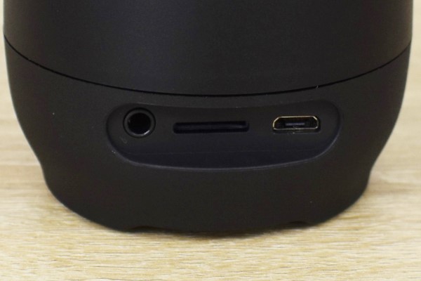 背面はマイク端子やUSBケーブル以外に、microSDカードが挿せる仕組み。SDカードを利用すれば、スマートフォンがなくても音楽を楽しむことができます。また裏側にゴム状の滑り止めの突起があるため、設置した時の安定感は抜群。