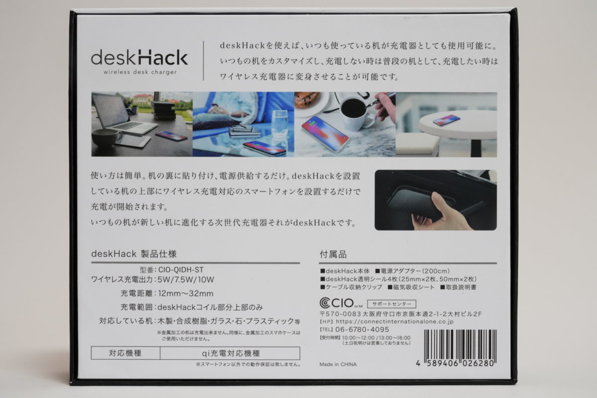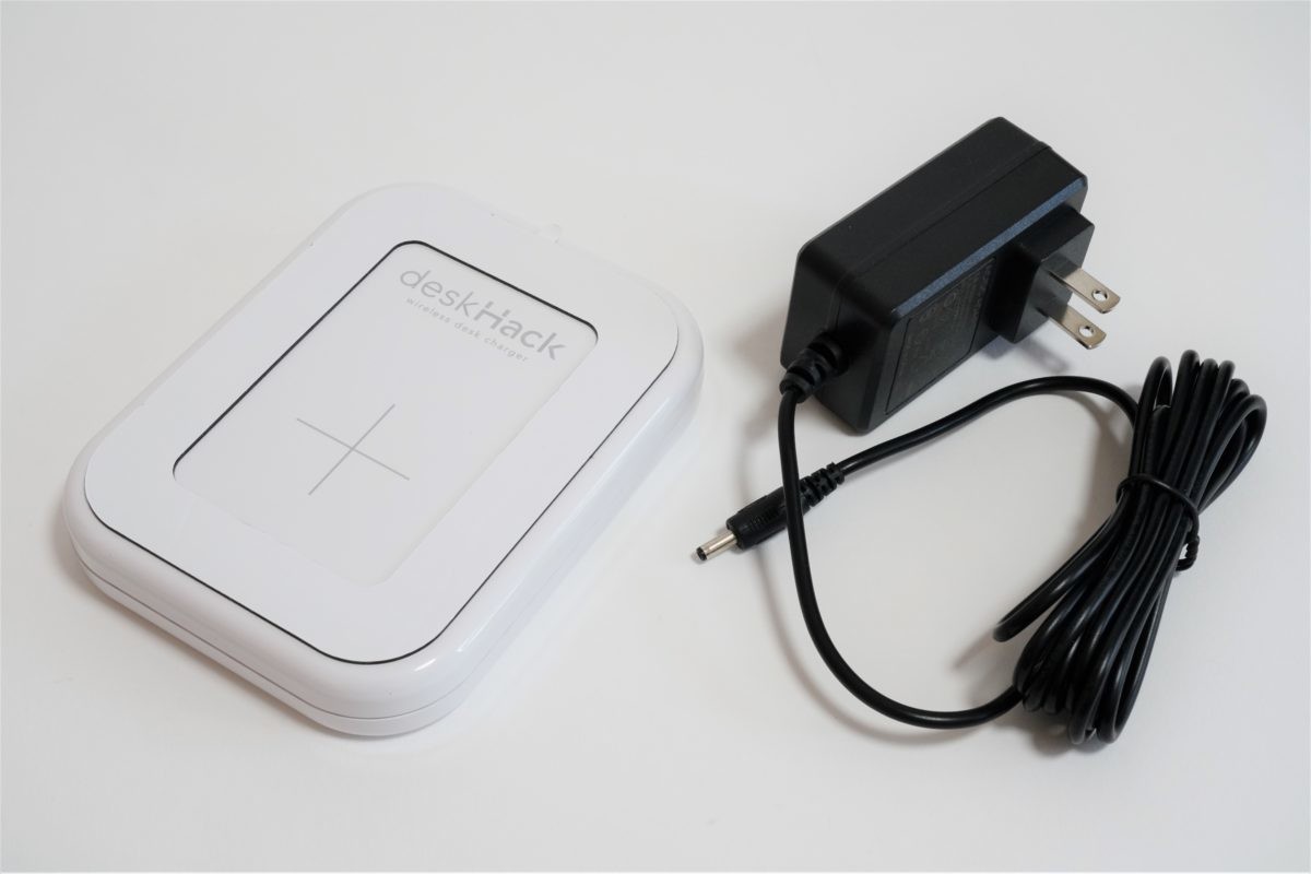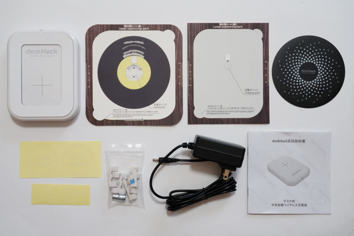 本製品のパッケージには同梱品が多数収められています。実際、単に設置するだけならdeskHack本体を机の下に装着して、ACアダプターをつなげばワイヤレス充電できます。しかし、充電可能な範囲はそれほど広いわけではないんですね。ある程度正確にスマホをdeskHackの真上に置かなければいけないわけです。