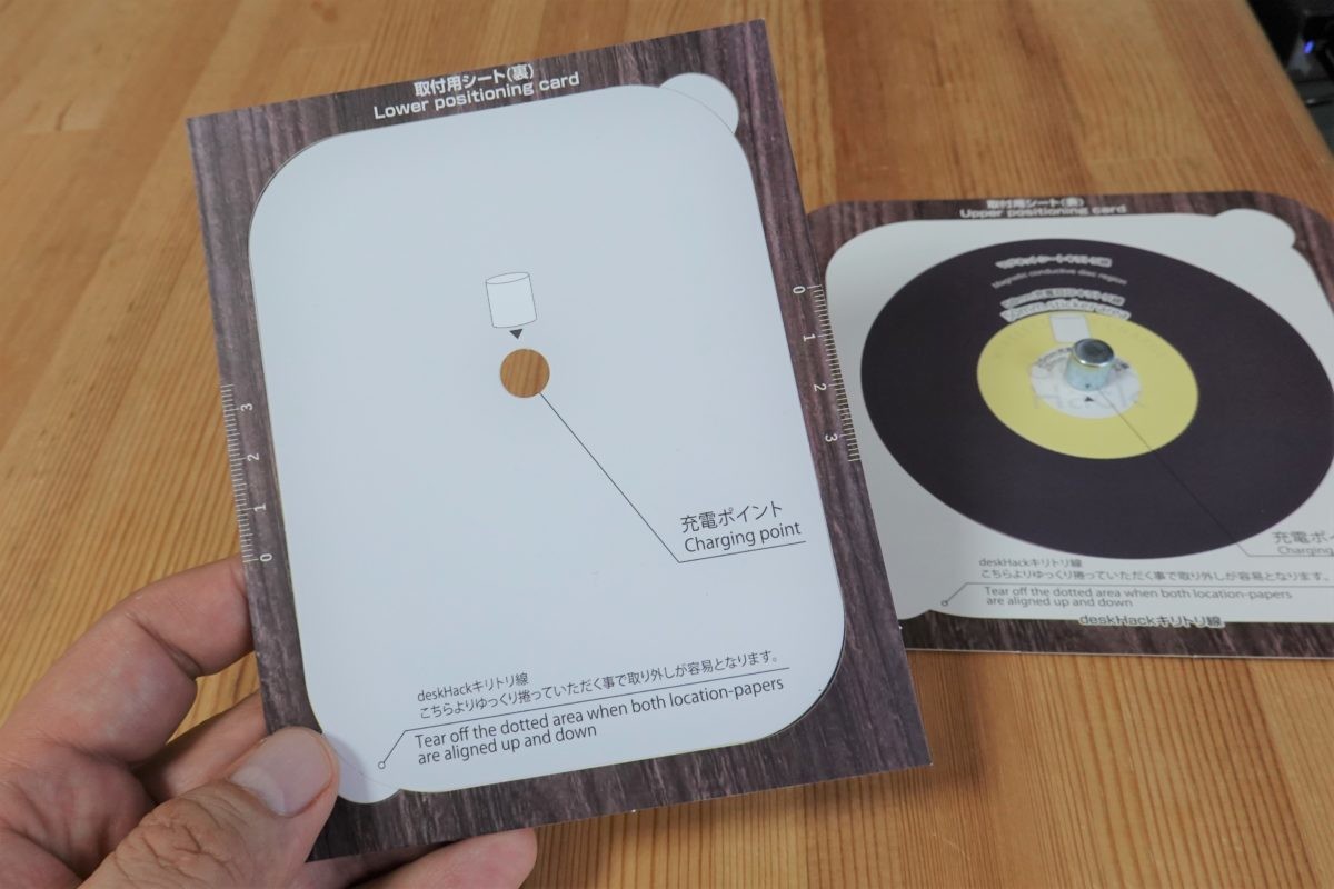 つまり、「取付用シート」と「固定マグネット」は、「充電目印シール」や「マグネットシート」をdeskHackの真上に正確に貼り付けるための治具というわけです。