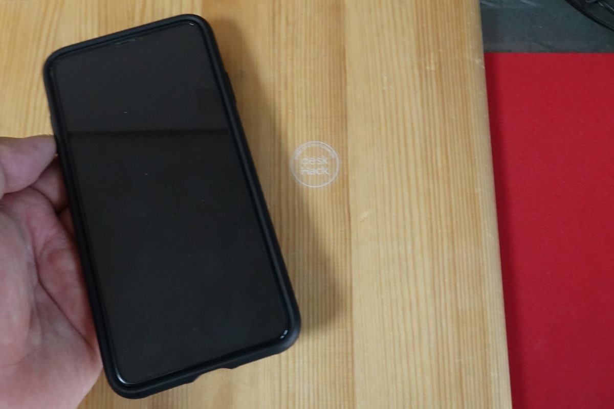 さて今回スペック上ギリギリの32mmの厚さの距離で充電を試してみたのですが、まったく問題なく充電できました。しかもケースを装着したままです。さらに20枚の付箋(厚さ約1.34mm)を挟んでみましたが、それでも充電できました。よほど厚い手帳型ケースや、桁外れに豪華な机でもないかぎりdeskHackを利用できそうですね。