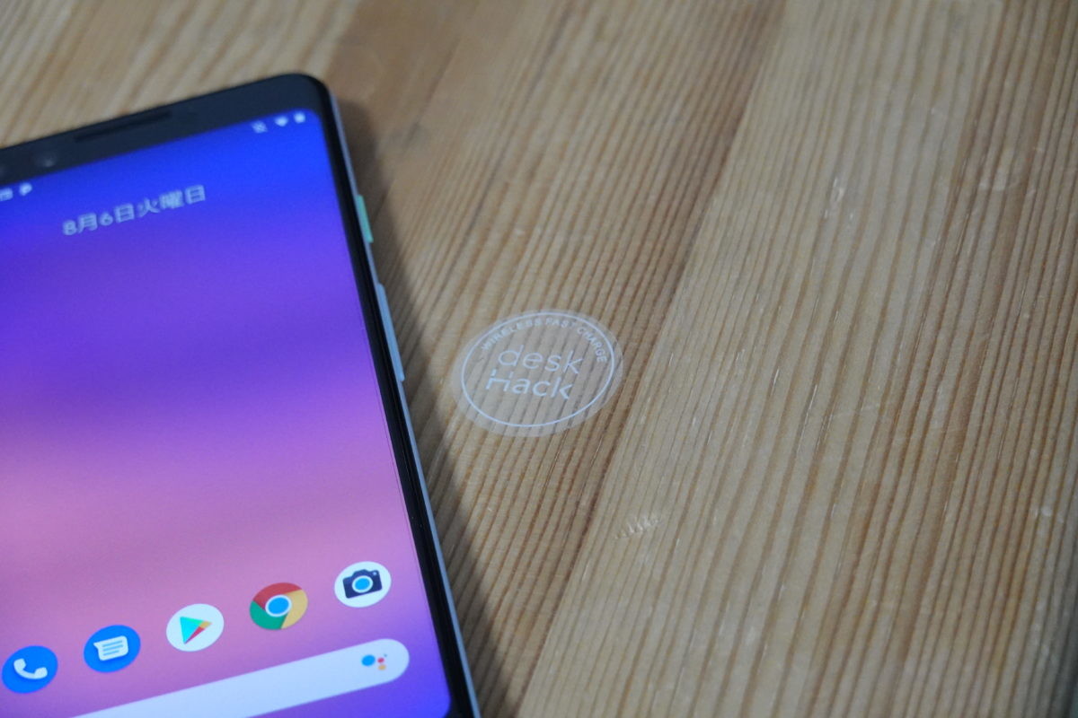 スタンド型またはマット型のQi充電器は端末を「セットする」という感覚が強いですが、deskHackでは机の上に無造作に置いていたスマホをスッと充電目印シールの上に滑らせるだけで充電が開始します。この新感覚を体験すると、スタンド型やマット型のQi充電器が野暮ったく感じられるほどです。