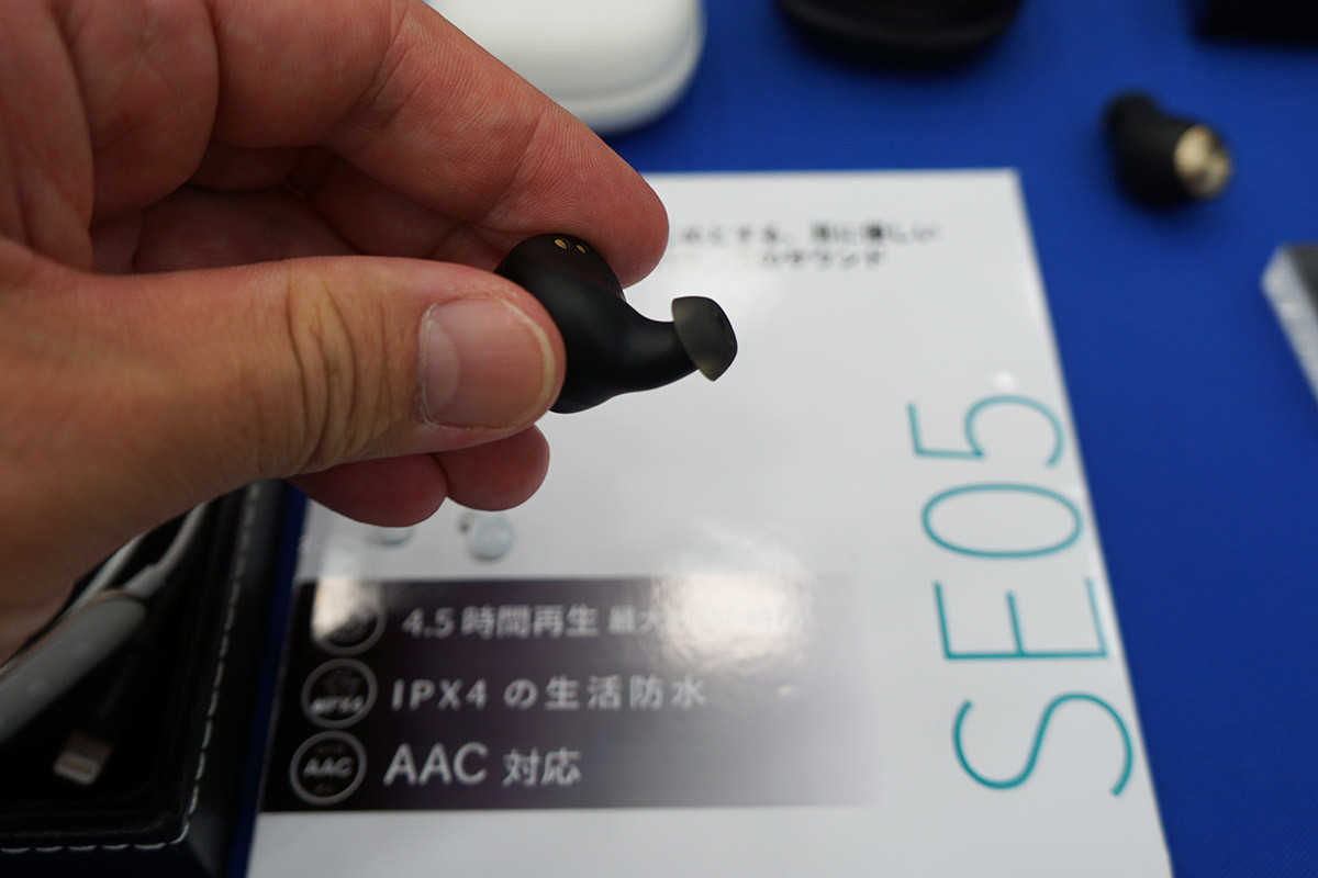 オウルテックブースでは、発売中の完全ワイヤレスイヤホン「Samu-SE03」の新色ピンクが参考出品されていたほか、9月中旬に発売される「Samu-SE04」も展示されていました。試聴をするだけでマイクロUSBケーブルがプレゼントされるということで、試聴希望者が途切れないほどの人気ぶり。