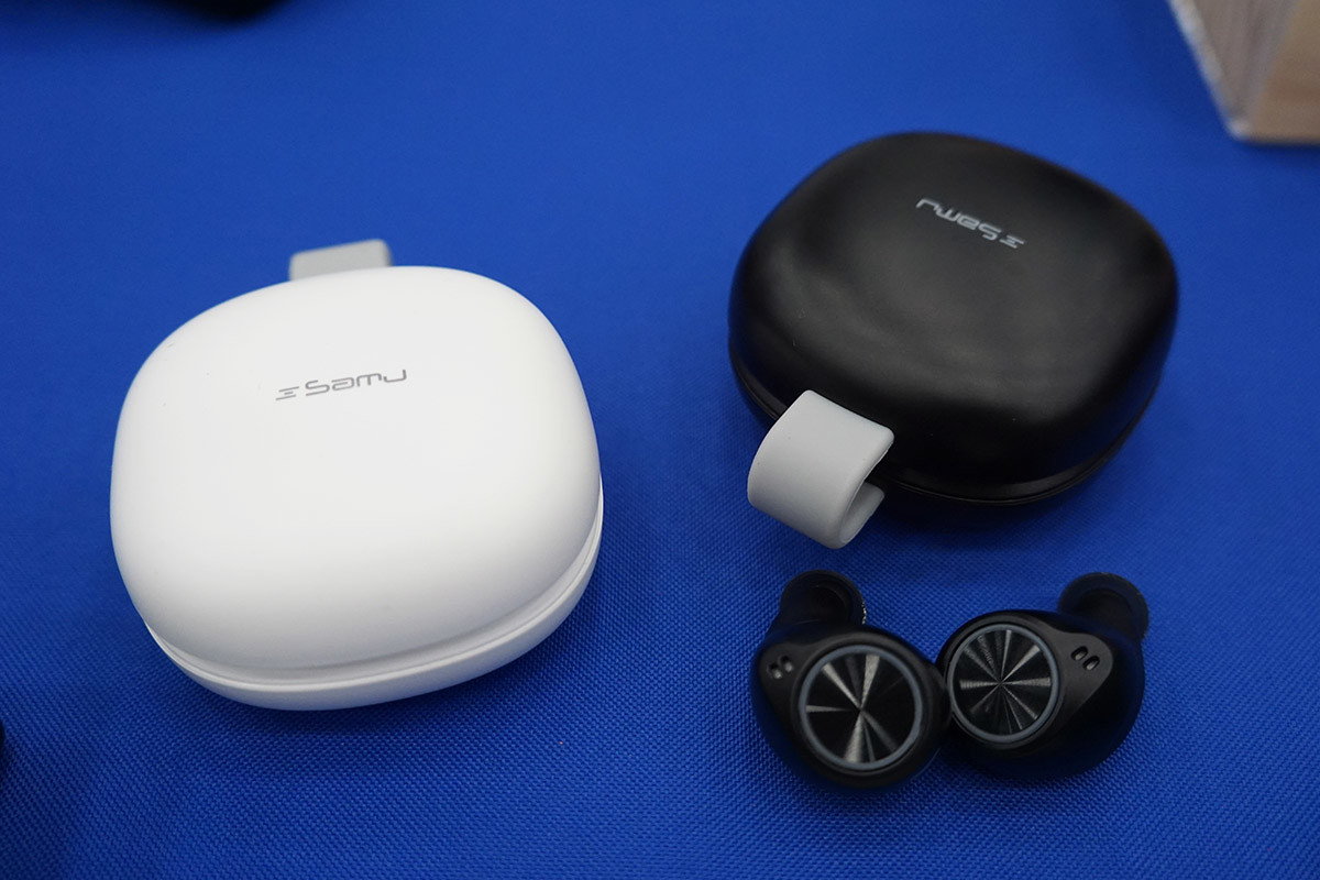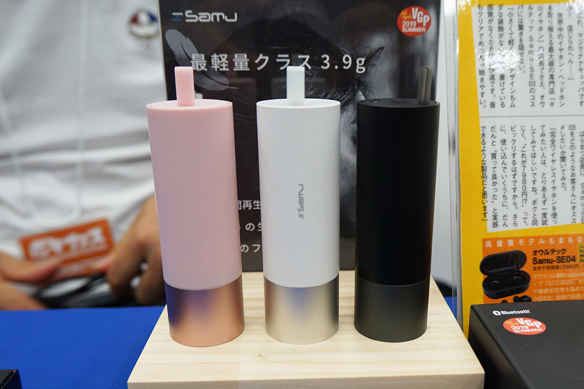オウルテックブースでは、発売中の完全ワイヤレスイヤホン「Samu-SE03」の新色ピンクが参考出品されていたほか、9月中旬に発売される「Samu-SE04」も展示されていました。試聴をするだけでマイクロUSBケーブルがプレゼントされるということで、試聴希望者が途切れないほどの人気ぶり。