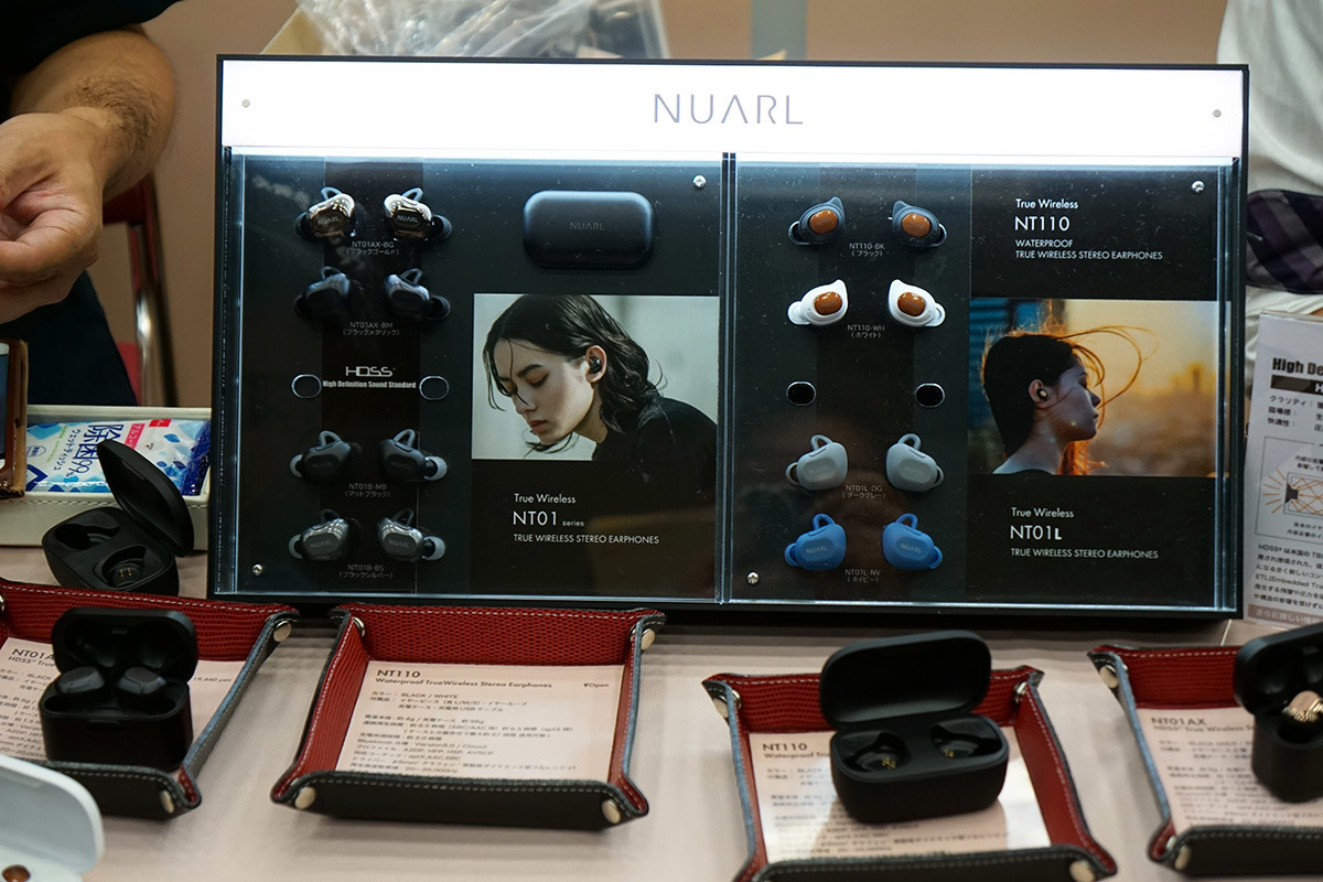 新進気鋭のブランドNUARL(ヌアール)のブースには、完全ワイヤレスイヤホン「NT01」や「NT110」のほか、有線イヤホン「NX30A」なども展示。同社の現行ラインナップがほぼすべて試せるとあって、多くのユーザーが熱心に試聴していました。