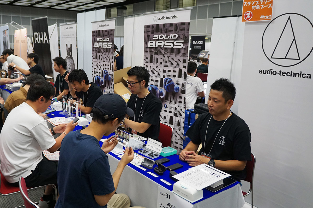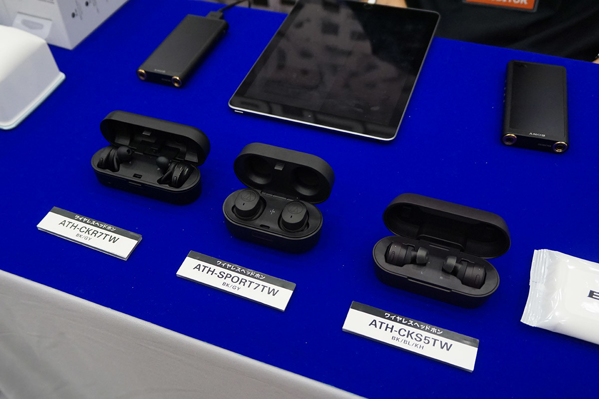 オーディオテクニカブースでは、7月に発売されたSOLID BASSシリーズの完全ワイヤレスイヤホン「ATH-CKS5TW」など3モデルを並べて展示し、自由に聴き比べることが可能に。