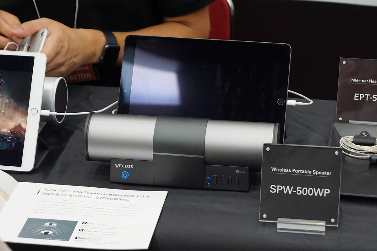魔法びんの技術を生かした「真空エンクロージャー」が特徴のベクロスブースでは、発売中のヘッドホン「HPT-700」やイヤホン「EPS-700」に加え、Bluetoothスピーカー「SPW-500WP」の試聴も可能となっていました。