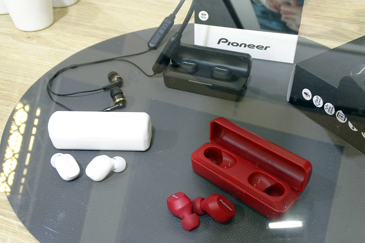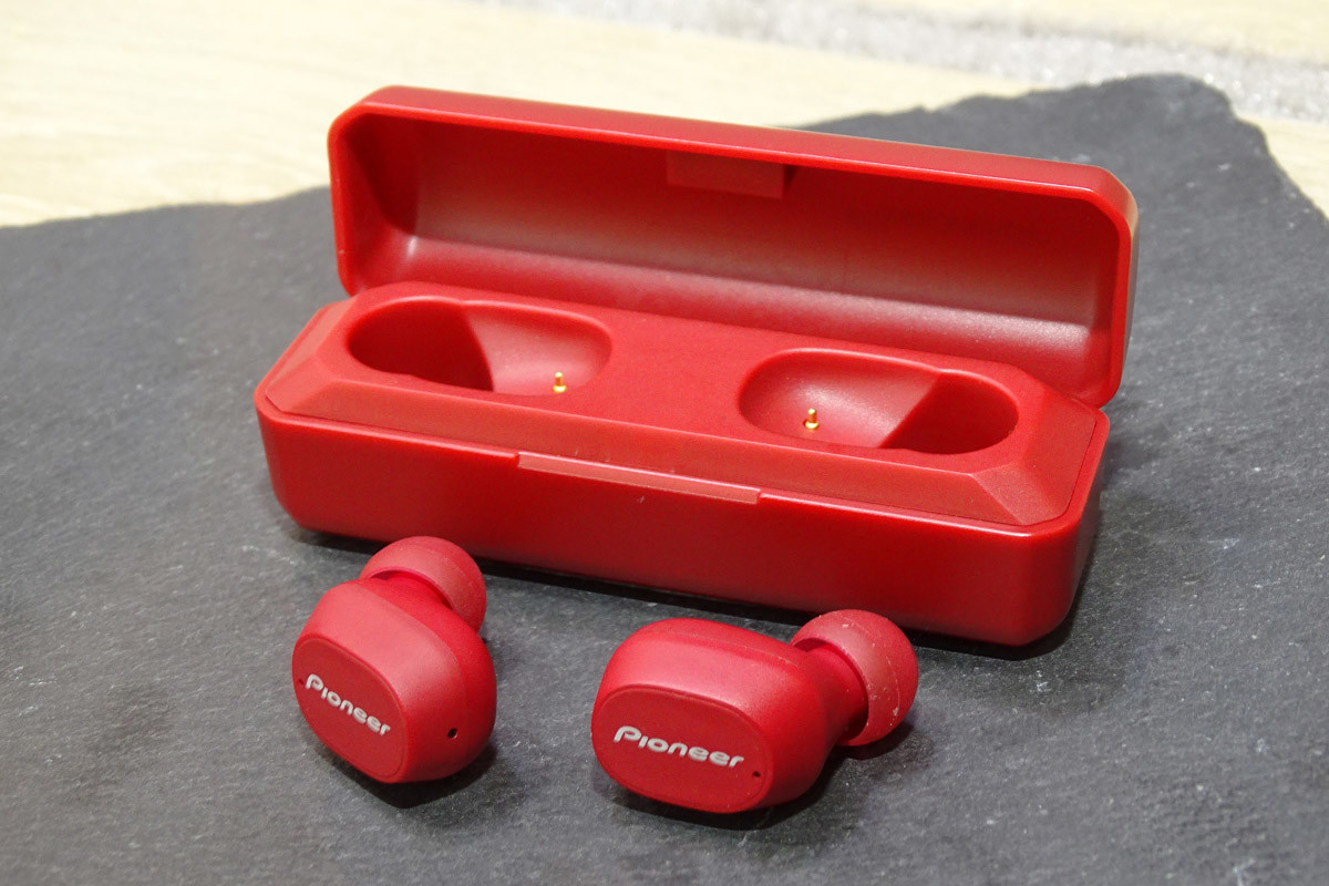 パイオニアの「C5(SE-C5TW)」はヨーロッパでの販売価格が99ユーロ(約1万2000円)というエントリーモデル。スティック形状のケースにイヤホンを格納します。鮮やかな深紅のほか、ホワイトとブラックが揃いました。
