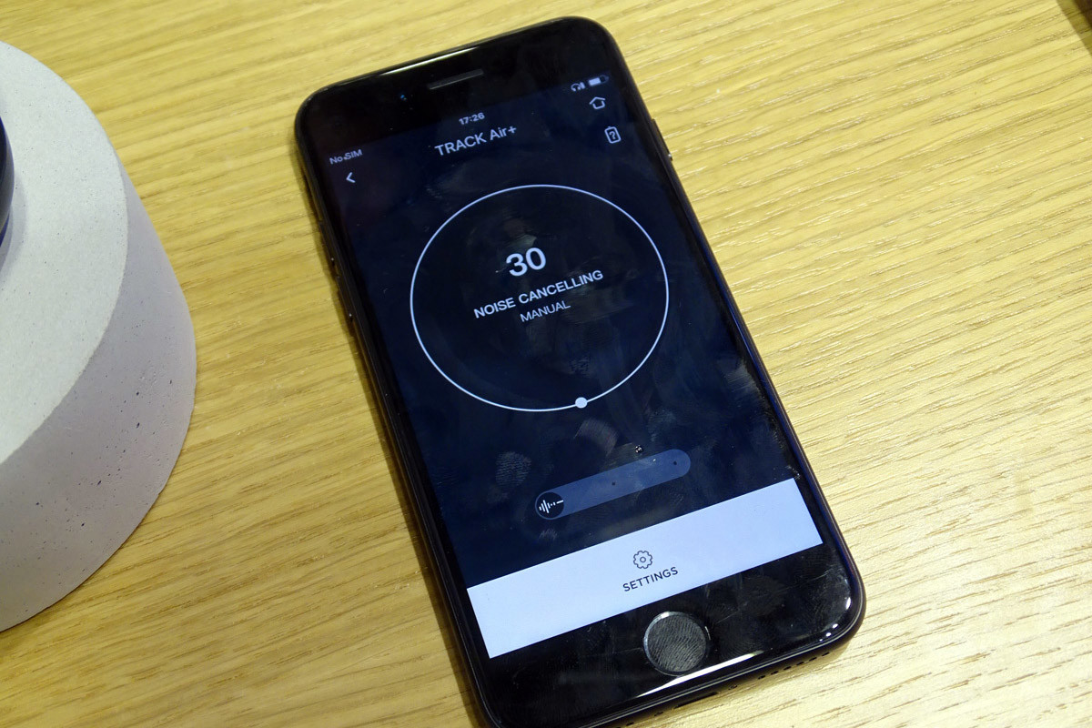 ひとつはデンマークのリブラトーンです。「Track Air+」という新製品はコンパクトな本体から想像できないほど、強力なノイズキャンセリング機能を搭載しています。専用アプリから消音レベルを0~30のレベルで1ステップずつ、好みに合わせて変えることができます。耳栓タイプのカナル型イヤホンとして、ノイキャン無しでも高い遮音性を確保しているため、レベルを最強の「30」にすると、目の前で製品について説明してくれているスタッフの話し声がほとんど聞こえなくなるぐらいのパフォーマンスを実現していました。