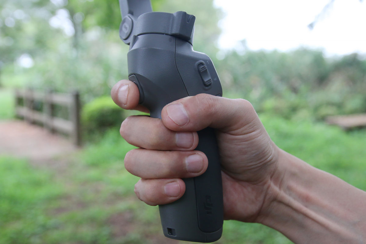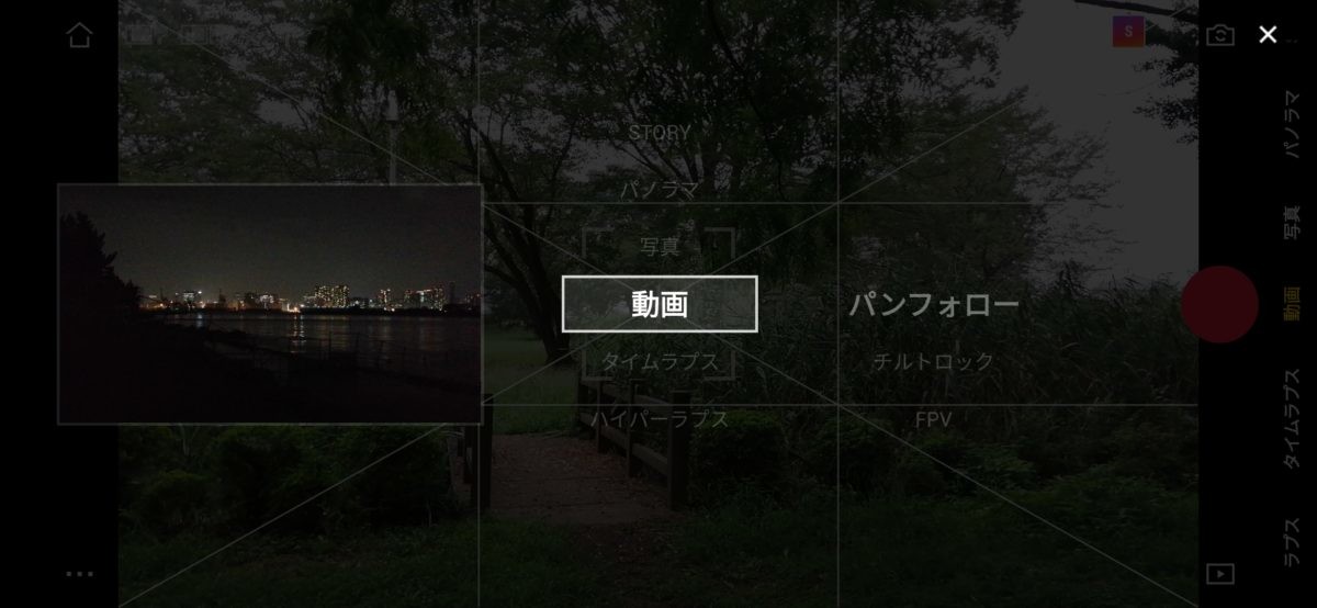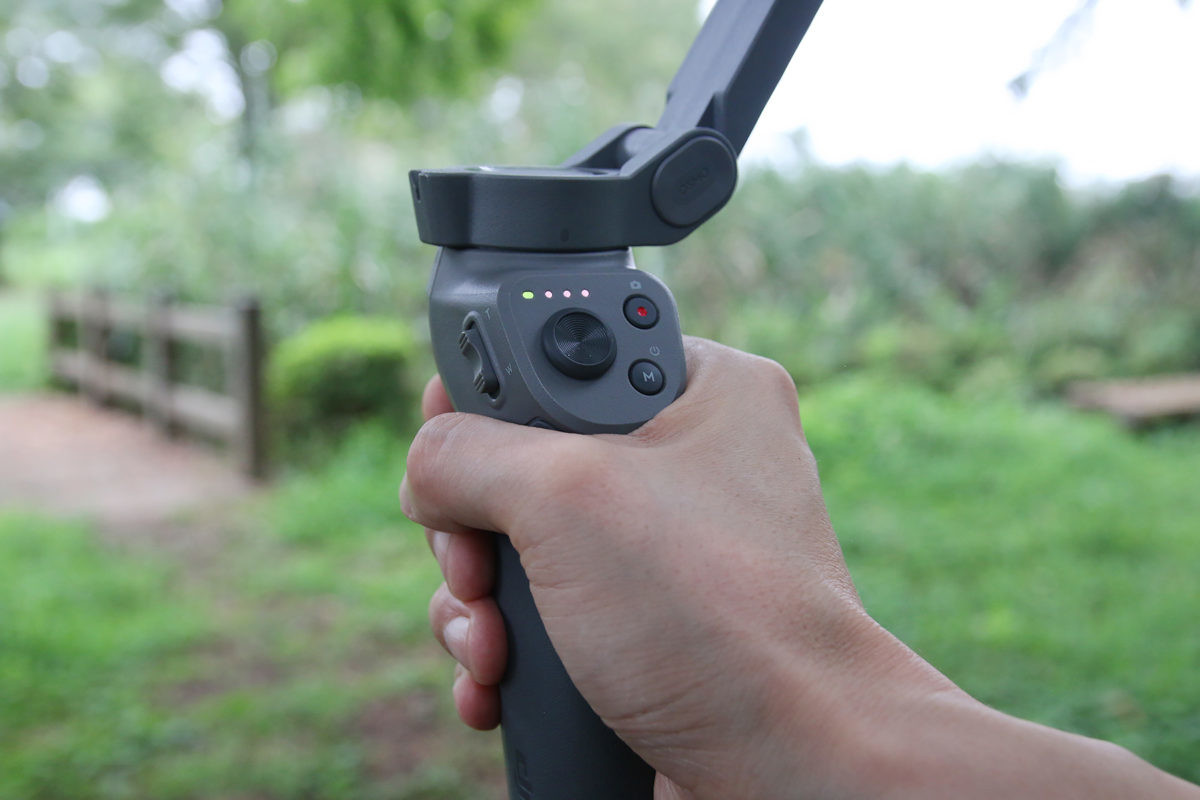 ほとんどの操作はスマートフォンの画面をタッチせずに、手元のボタン類でできてしまう。さらに人差し指のトリガーボタンとのコンビネーションで各種モード変更や設定なども可能。ズームだけは、左利きの人にはちょっと使いづらそうだ。デフォルトではMボタンを押すと写真と動画のモードが切り替わる。これは設定を変更して撮影メニューを開くこともでき、Osmo Pocketと同じような感覚で操作できるようになる。個人的には後者のほうが使いやすかった。