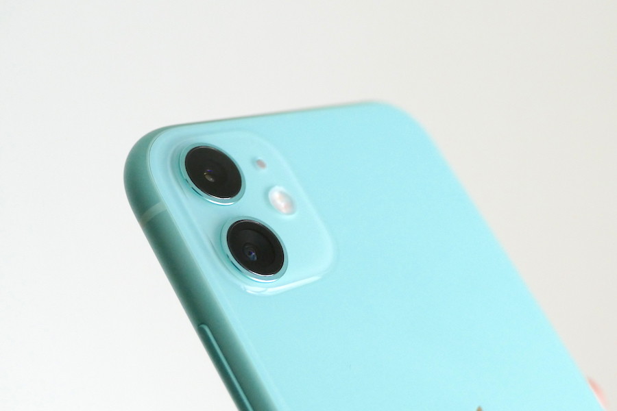 iPhone 11は、航空宇宙産業グレードのアルミニウムを側面のフレームに使用します。光沢感のある背面ガラスの表面は、適度に手に吸い付くような触り心地。iPhone XRの質感に近く、光の角度によってはわずかに周囲の風景を反射します。
