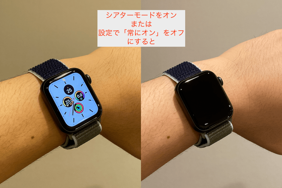 その上で、連続使用時間はSeries 4と同じ。また、「シアターモード」を有効にすれば、映画館や就寝時などの点灯させたくない場所で一時的にオフにすることも可能だし、「設定」の「画面表示と明るさ」>「常にオン」からオフに切り替えれば、無効にしてバッテリー持ちを優先させることも可能。常時表示のせいで使い勝手が悪くなるという心配は一切ない。