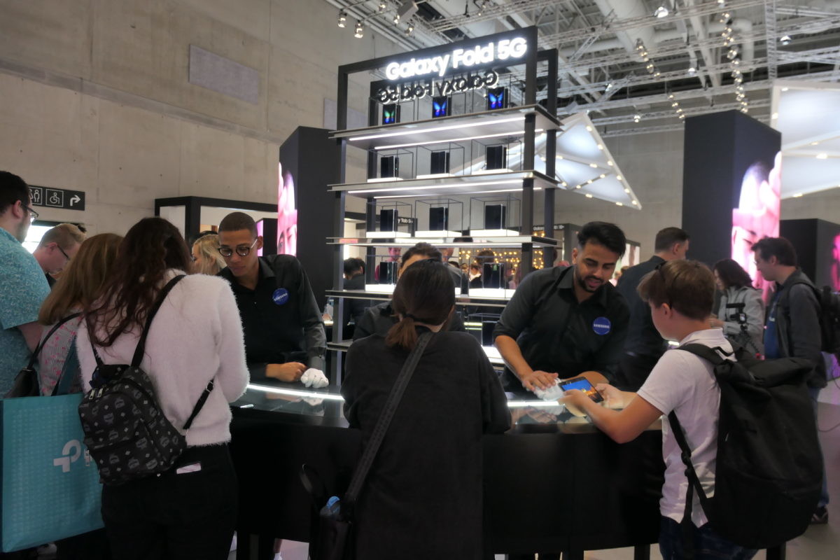 Galaxy Foldは今年の2月に発表され、当初は4月から販売が開始される予定でした。しかし、発売前にレビュアーに貸し出した端末で不具合が発見され、改良のために発売が延期。IFAでは、改良によって完成度を高めたGalaxy Foldを9月6日から発売することを発表。サムスンのブースには同モデルが触れる状態で展示され、連日行列ができていました。筆者は、ブースとは別の場所で、報道向けに用意された端末に触れてきました。