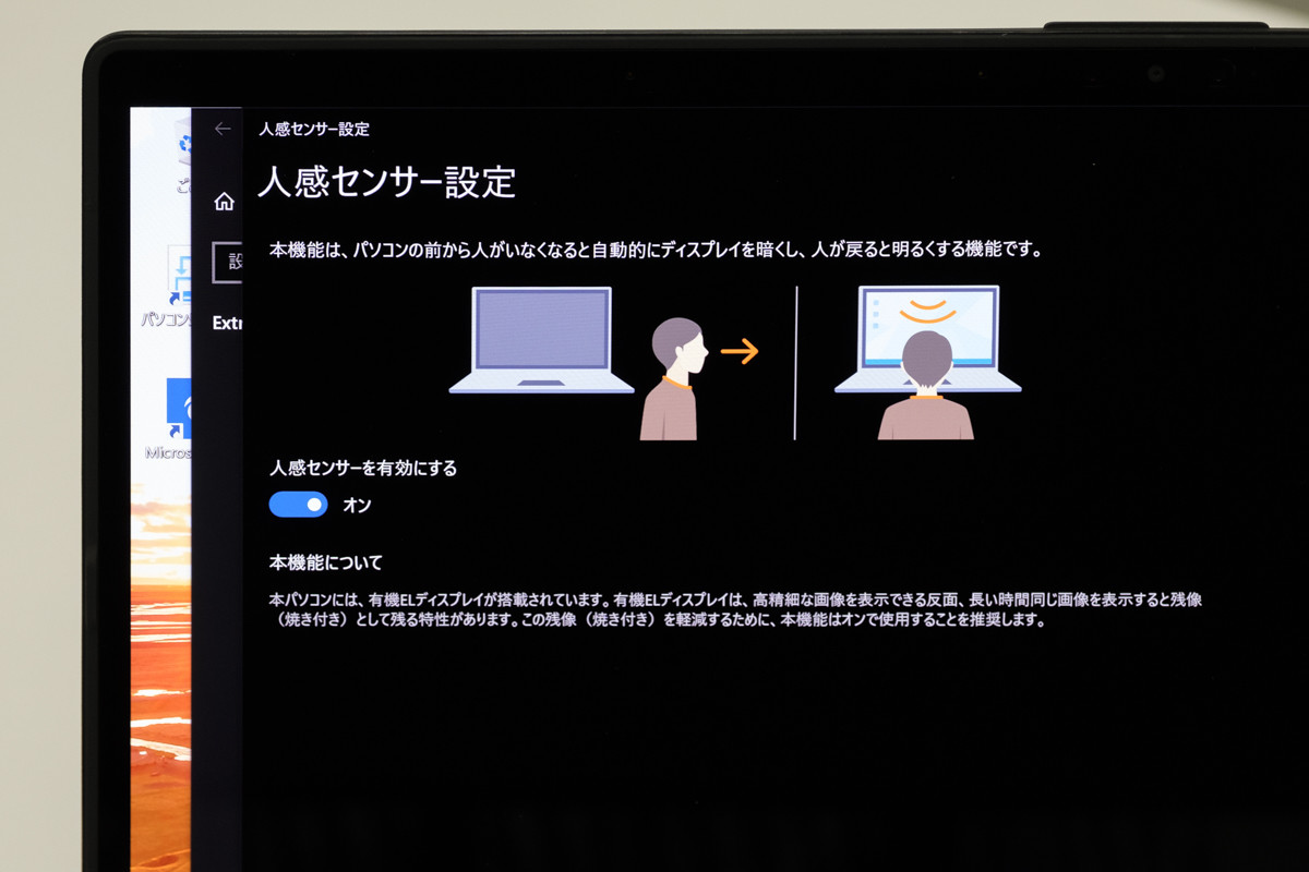 AH-Xは、ディスプレイを長く使えるようにも配慮されています。長時間ディスプレイを表示していると起きる「焼き付き」防止のため、人感センサー技術を応用して、モニター前に人が座った際に輝度が上がり、人がいなくなれば輝度を下げる機能を採用。