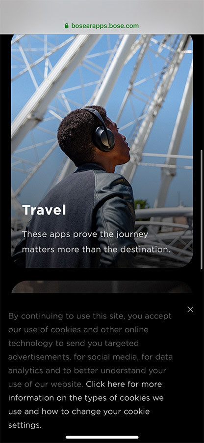 Bose Musicアプリを開くとホーム画面に「Bose AR」というメニューがあります。こちらは音声によるAR/拡張現実コンテンツが楽しめるボーズ独自のプラットフォームサービスです。開くと「Bose ARアプリ」がフィットネス/トラベル/エンターテインメントの3つのテーマに分けられていて、いくつかのアプリが並んでいます。どれもが英語にしか対応していないのが残念ですが、いずれBose ARのコンセプトとサービスを日本でも体験できる機会を楽しみに待ちましょう。