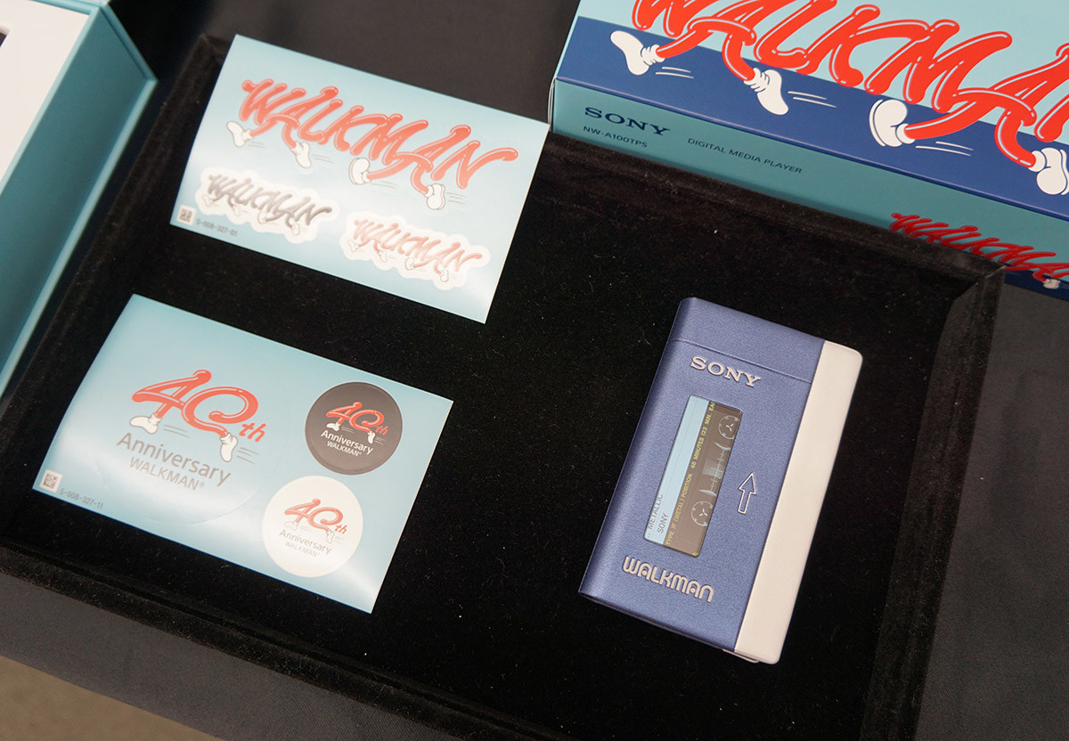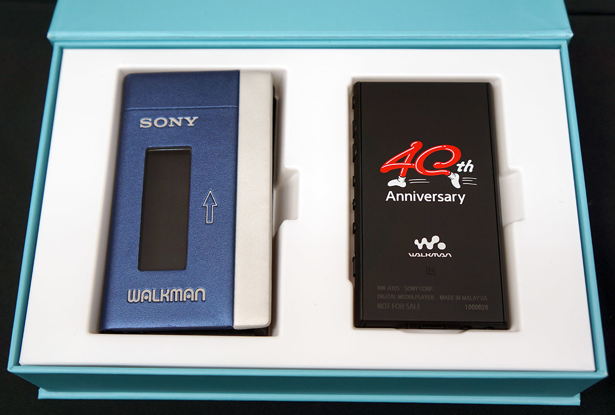 1979年に発売された初代ウォークマンの誕生40周年を記念したアニバーサリーモデルNW-A100TPSは、A100シリーズをベースに、背面に40周年記念のロゴプリントを施し、初代ウォークマンTPS-L2デザインのソフトケースや2種類のステッカーを同梱した期間限定モデル。パッケージも初代のデザインを再現しています。