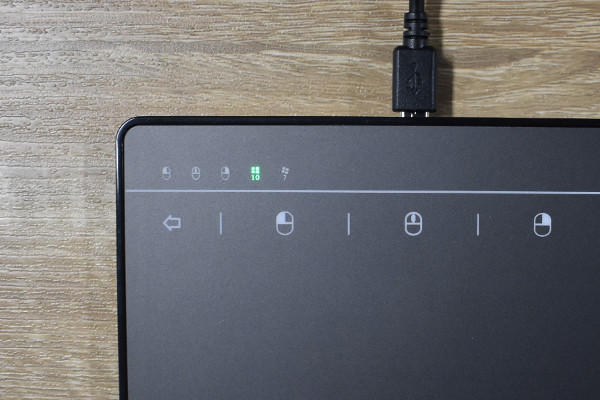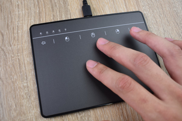それでは、パソコンに接続して使い心地をチェックしていきましょう。タッチパッドの上段には左クリックや右クリックのマークだけでなく、「戻る」や「進む」などのショートカットも搭載されていました。パネルの部分を指でタッチすれば、画面上で右クリックできるようになります。2本指で上下に動かすとページをスクロールすることが可能。直感的な操作ができるおかげで、さらに作業効率がアップしそうですね。