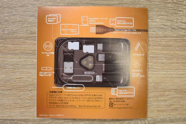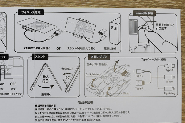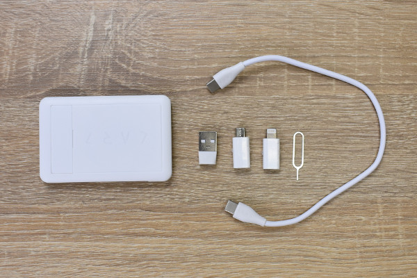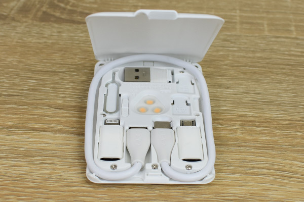 それでは、本体を開いて中に入っているツールをチェックしていきましょう。ケースにグルッと巻かれた約27cmのType-C to Cケーブルの他に、Type-C to A 変換コネクタ・Type-C to Lightning 変換コネクタ(非MFi)・Type-C to MicroUSB 変換コネクタ・SIMカードイジェクトピン・nanoSIMカードホルダーなどが入っていました。ケーブルとコネクタを全て組み合わせれば6種類の接続方法に対応。コネクタが1つに集約されているため、充電式のガジェットをたくさん使用している人におススメですよ。