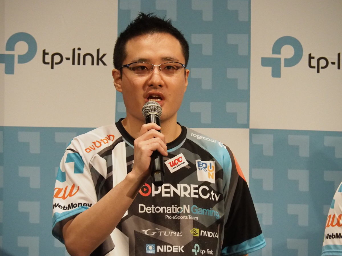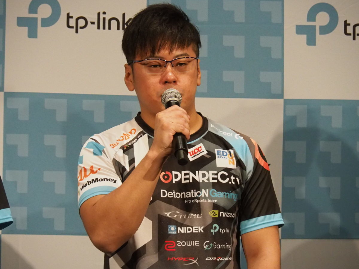 ゲーミング向けのルーターと言うことで、今回の発表会には、老舗プロゲーミングチーム、デトネーションゲーミングからSUMOMOXqX選手とMelofovia選手、梅崎オーナーの3人が登壇しました。SUMOMOXqX選手とMelofovia選手は、「PUBG」の選手。一瞬の判断や操作の差によって勝敗が決するゲームだけに、遅延には敏感なゲームタイトルです。「Ping(レイテンシー)が10の差が出ました。時間にして0.01秒差ですが、プレイ感覚に影響します。普段の有線と同じ感覚でできました」とSUMOMOXqX選手。