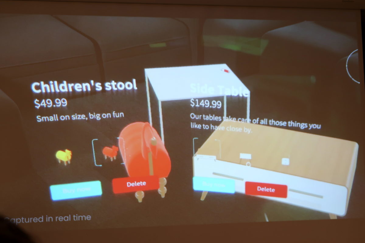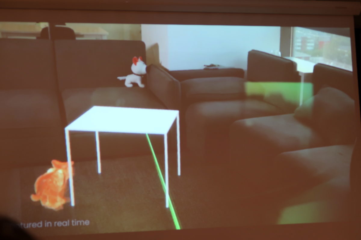 アプリを立ち上げると、会場の床に置かれた机と猫が見えました。ポインターが猫じゃらしのようになっていて、それに合わせて猫が飛び付き遊んだりできます。さらに、床に家具を置いたりして、部屋をカスタムすることもできます。家具は課金で、有償になるそうです。